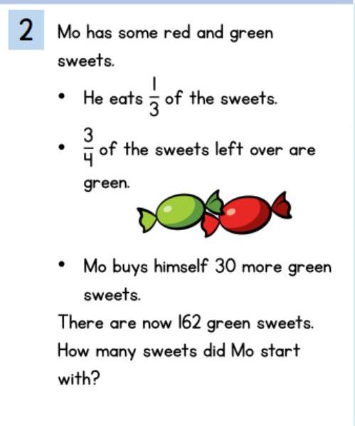 Using the information from the final statement in green, ‘162 green sweets, how many sweets did Mo start with?’ We know from the above that the final (target) amount of green sweets is 162, let’s give this a name… TotalGreenSweets Moving upwards to the next statement, ‘Mo buys himself 30 more green sweets’ We worked out from the step previously that the TotalGreenSweets = 162 at the END, this … Read More
